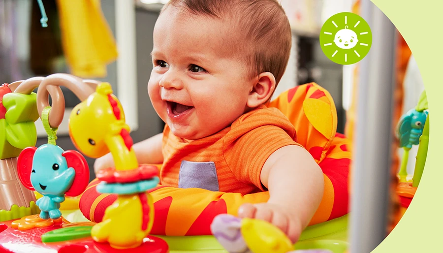 鏡付きのおもちゃは、自己発見を促します。頭上におもちゃがあるジムは追視を促し、聴覚作用(音や光)のあるおもちゃはモノには原因と結果があるということを理解させます。もちろん、手触りのよい歯固めも効果的です。赤ちゃんは皆、口に物を入れることから感覚を探求し始めます!