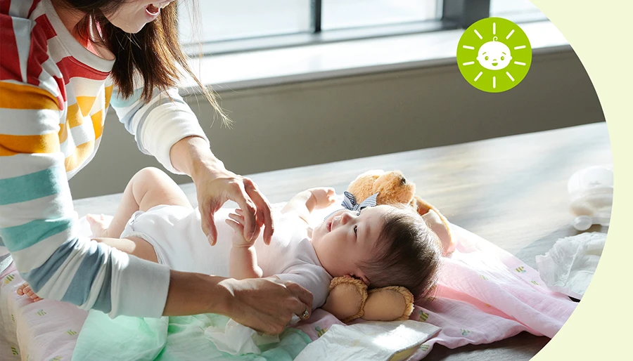 おむつ替えは、赤ちゃんの五感(味覚を除く!)に働きかける絶好の機会です。ローションが肌に触れる感触、あなたの手のぬくもり、目に入るあなたの顔、話し声、歌を聞くことなど、赤ちゃんと触れ合うとても良い時間になり得るのです。