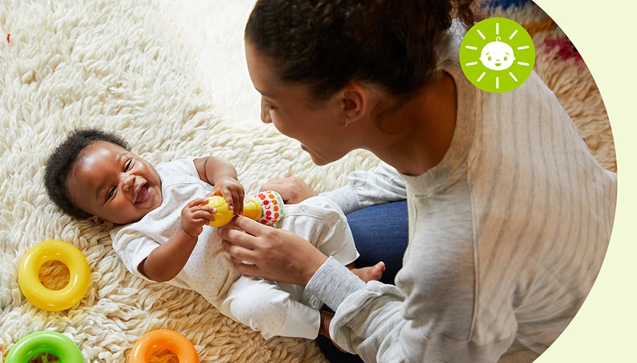 生後3カ月くらいになったら、ぎゅっと握った手をそっと開いて、小さなガラガラを持たせてみましょう。こうすることで、赤ちゃんは自分の感覚を自主的に働かせることができるようになり、自分の行動が物事を動かすことを理解し始めます。