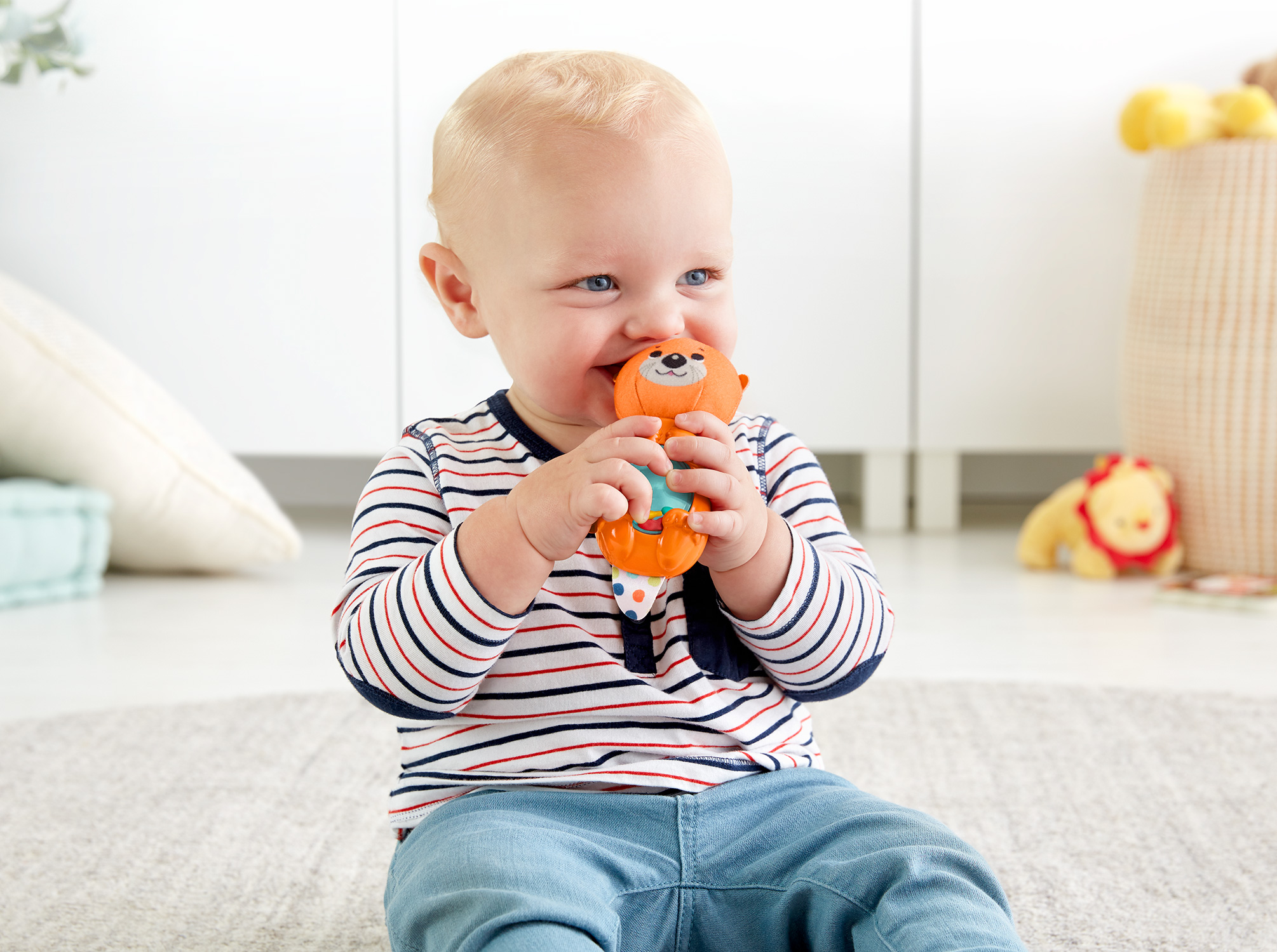 ラッコを振ると、カラカラと楽しい音が鳴ります。聴覚の発達とともに、遊んでいる自分の動きとおもちゃの連動を認識していき、動作と作用のつながりを発見します。