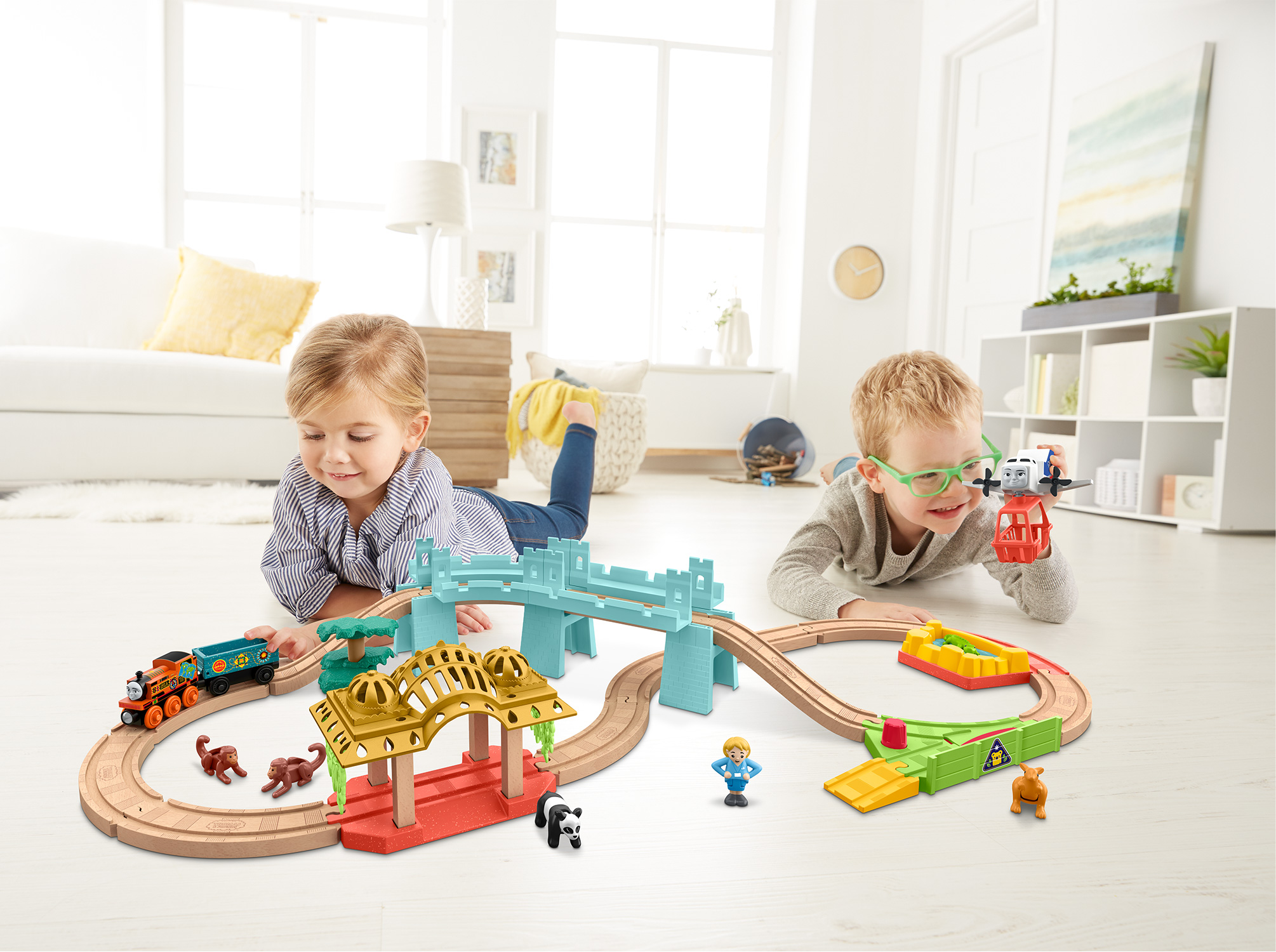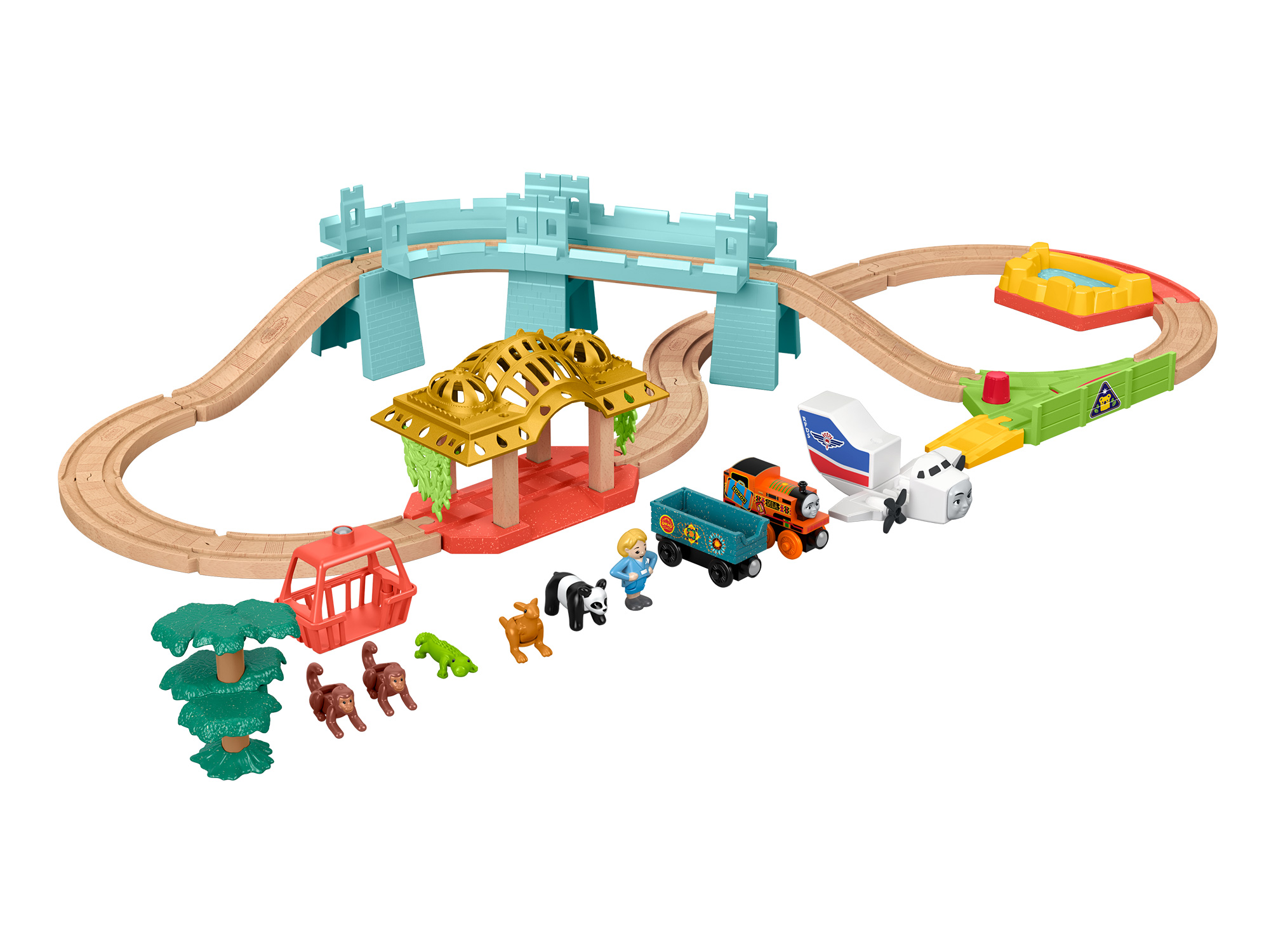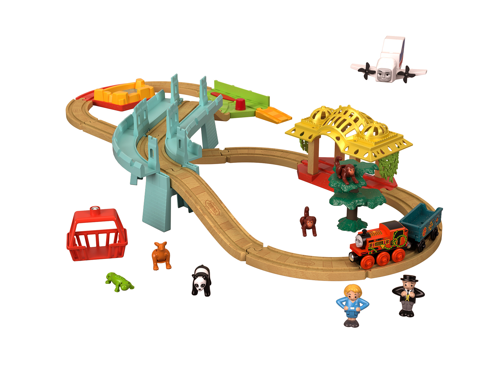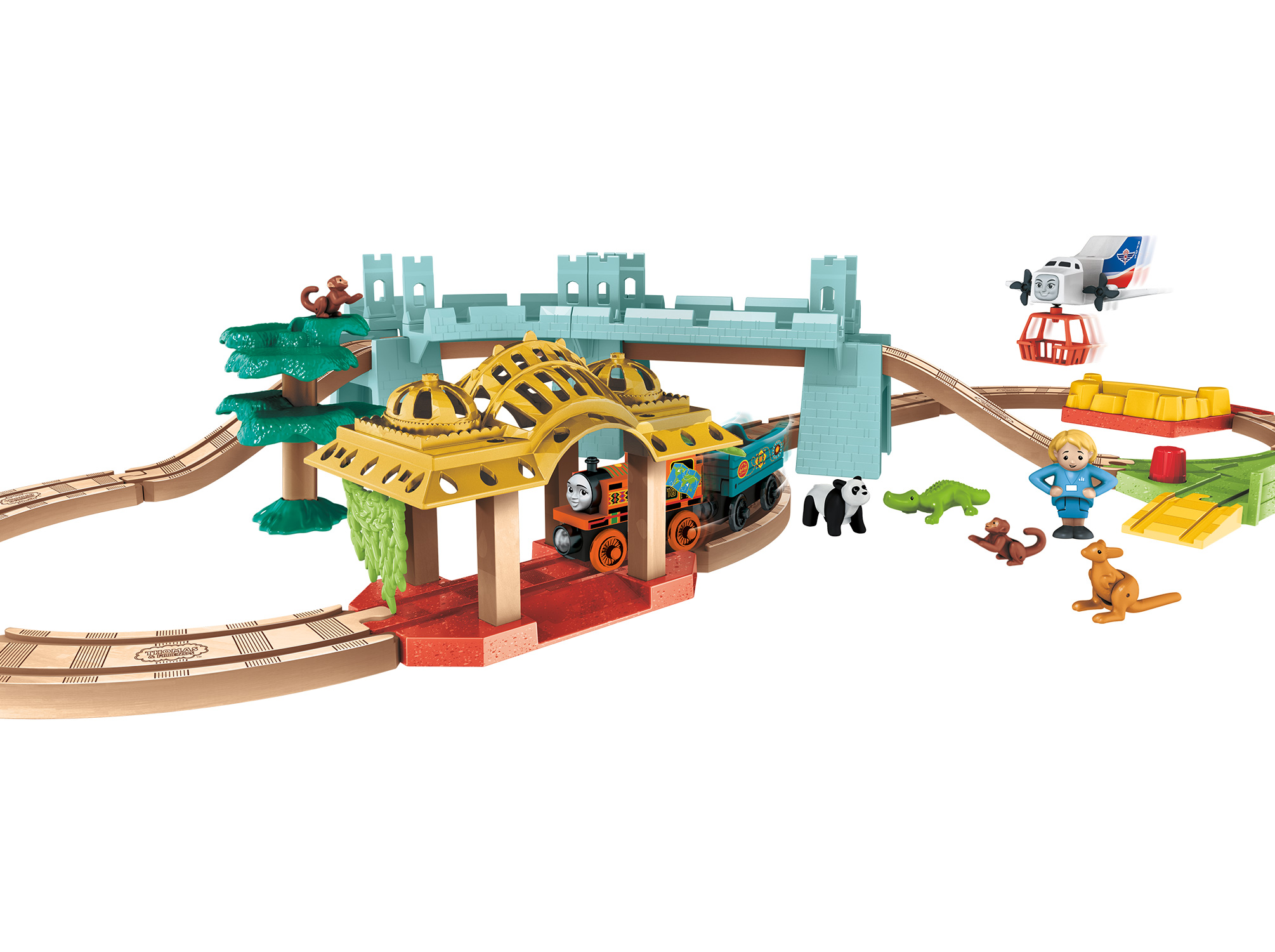 いじわる貨車・いたずら貨車とチャーリーはクレーンのオペレーターと一緒に大忙しで働ているプレイセット。クレーンを動かして荷物を上げ下ろしするのを手伝ってあげよう!※レールアダプター2本付き
