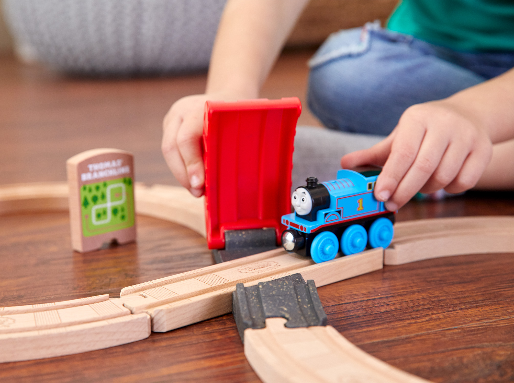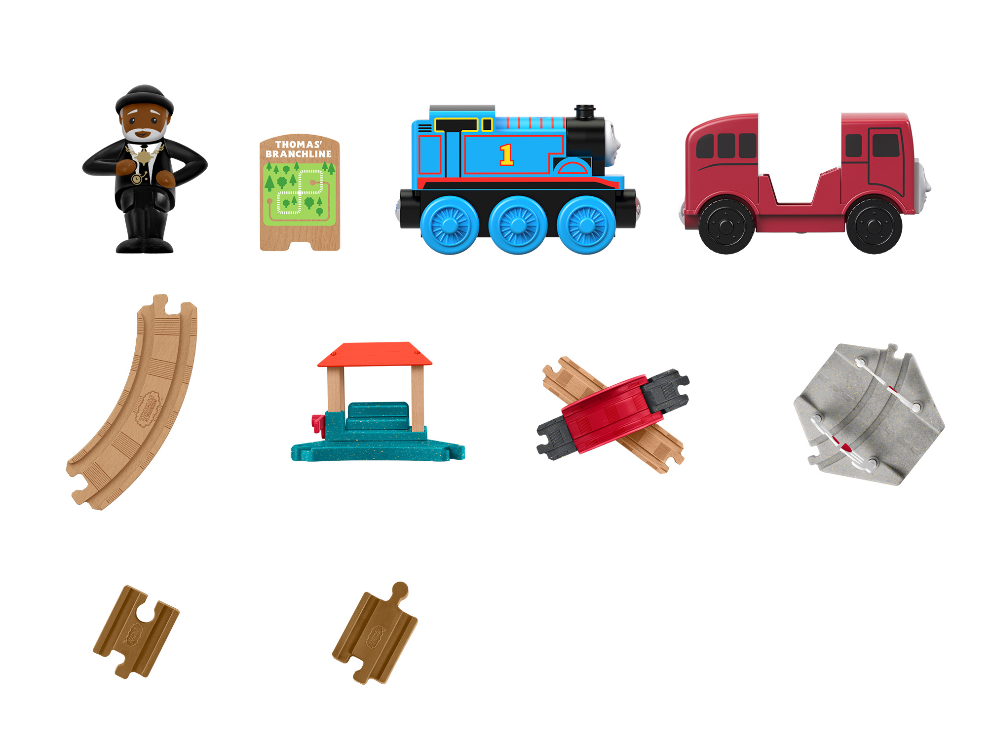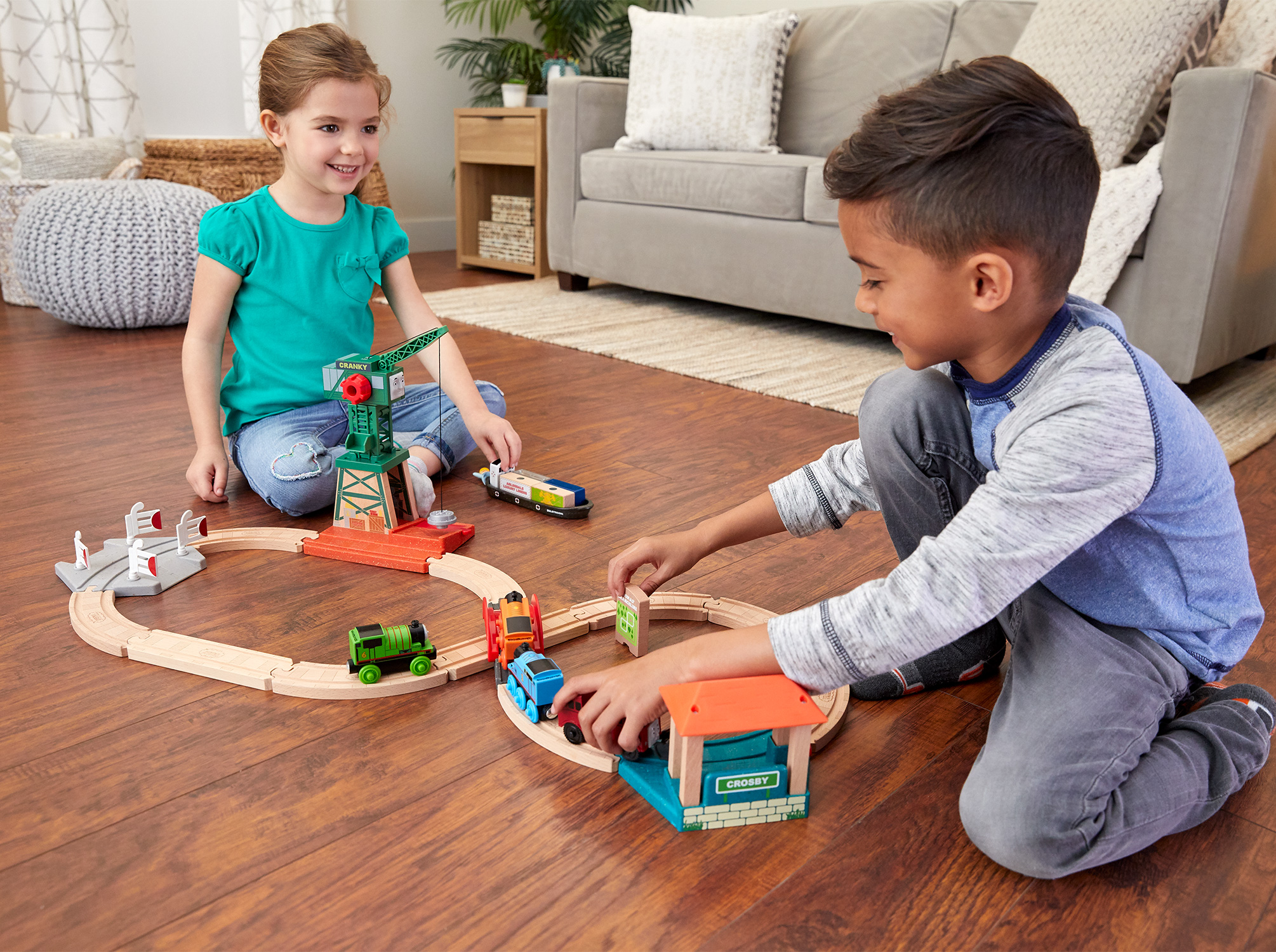 いじわる貨車・いたずら貨車とチャーリーはクレーンのオペレーターと一緒に大忙しで働ているプレイセット。クレーンを動かして荷物を上げ下ろしするのを手伝ってあげよう!※レールアダプター2本付き