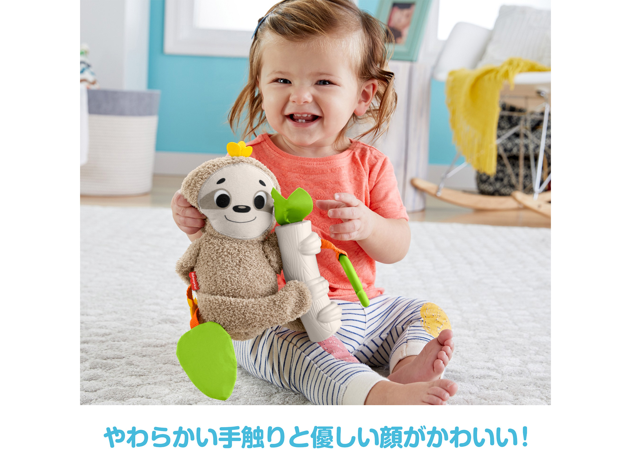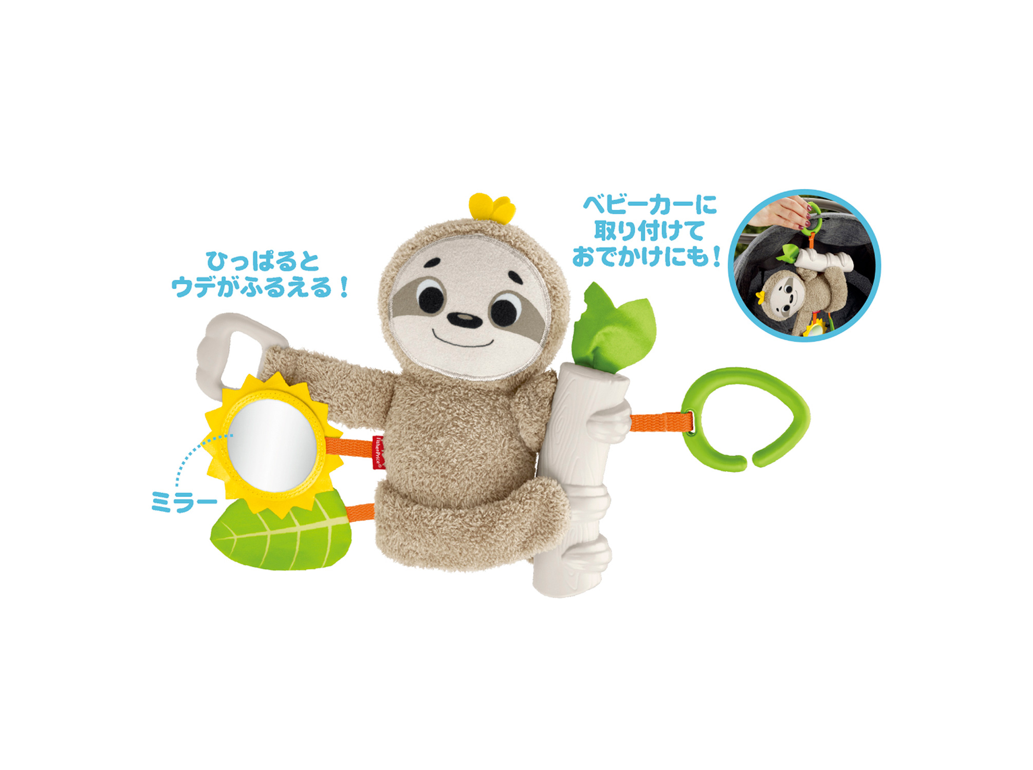 やわらかい手触りな優しい顔をしたナマケモノ!ウデをひっぱるとふるえるアクションが楽しめて、お顔が映るミラーも。カシャカシャ音が鳴るサテン生地の葉やデコボコした枝など目・手・耳の感覚を刺激します。ベビーカーにも簡単に取り付けできるので、お出かけにも!