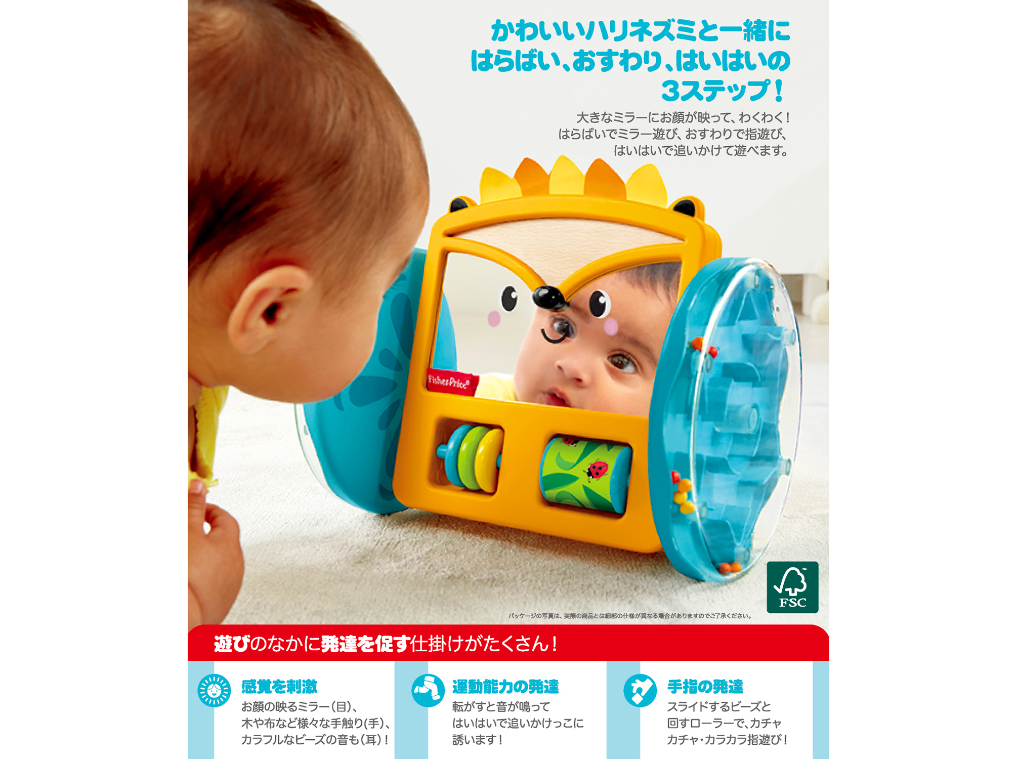 ハリネズミの顔はお子さまが大好きな鏡になっているので、自分の姿を見て興味津々になるはず!?