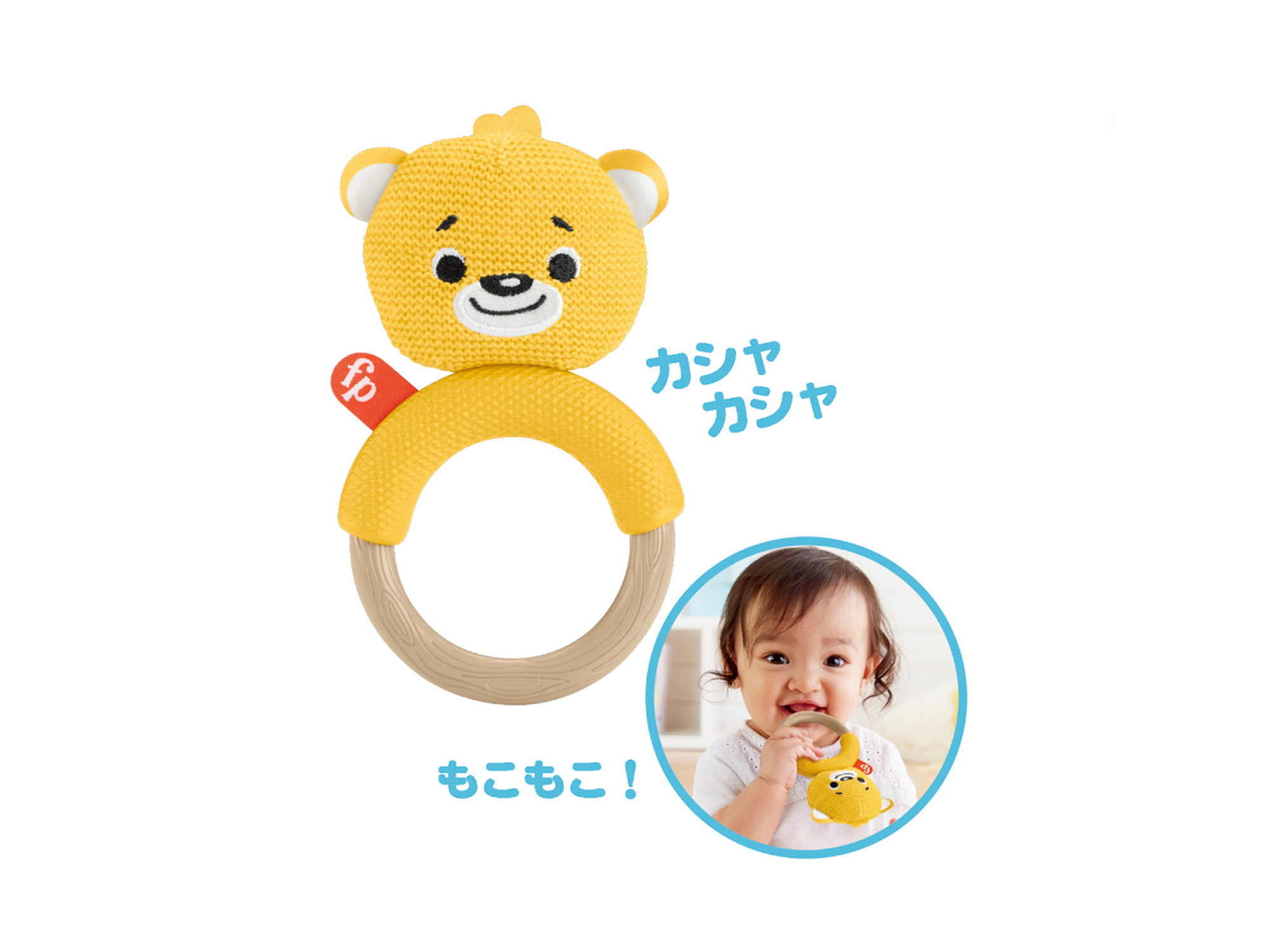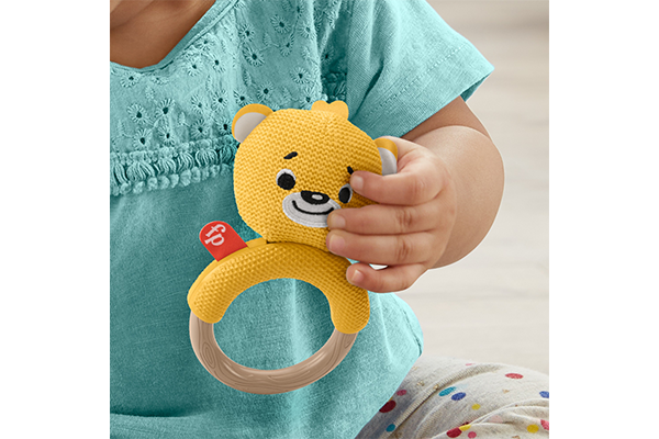 やわらかいニット素材。お子さまの手にやさしくフィットしながら、歯固めにも!