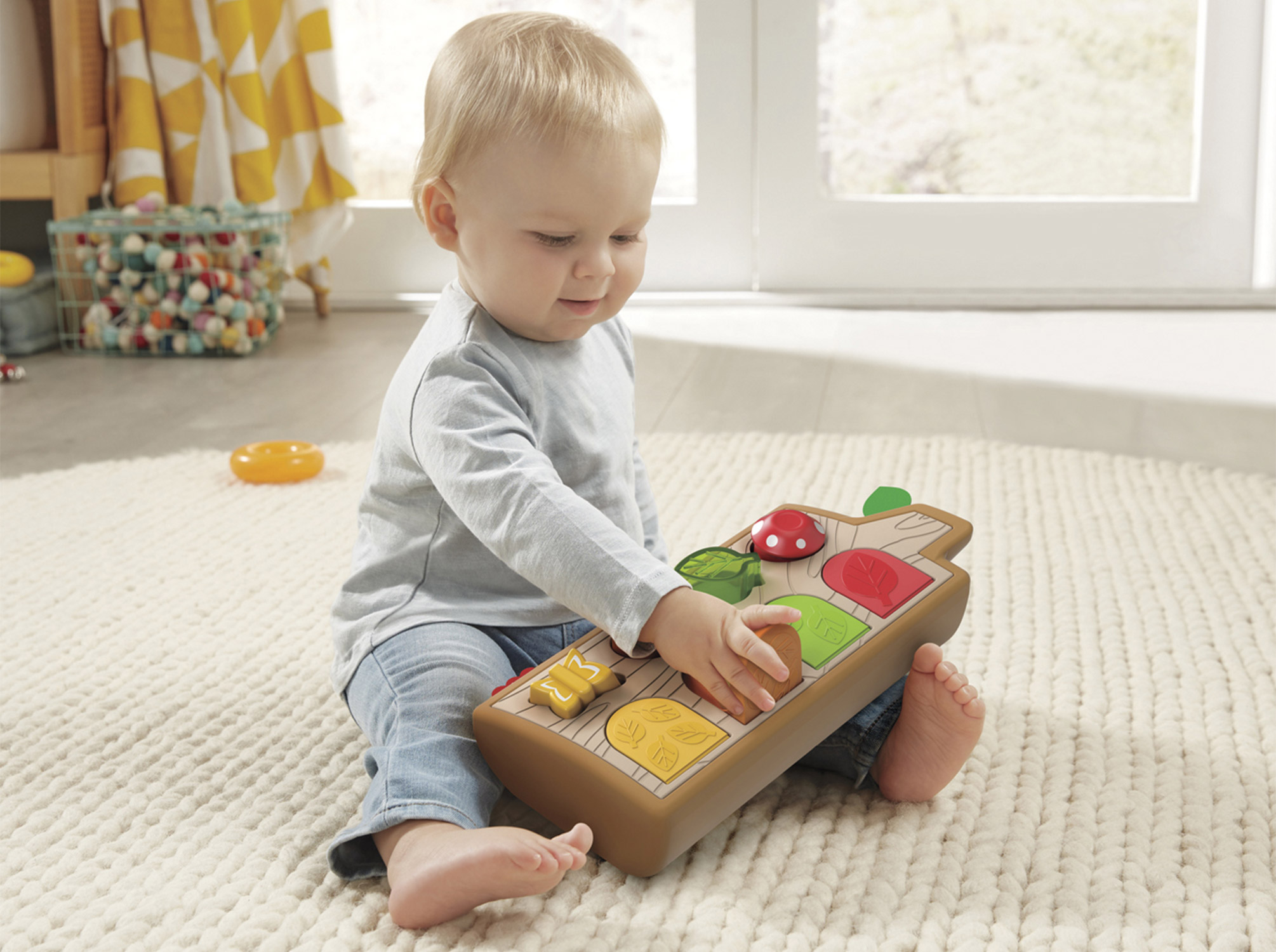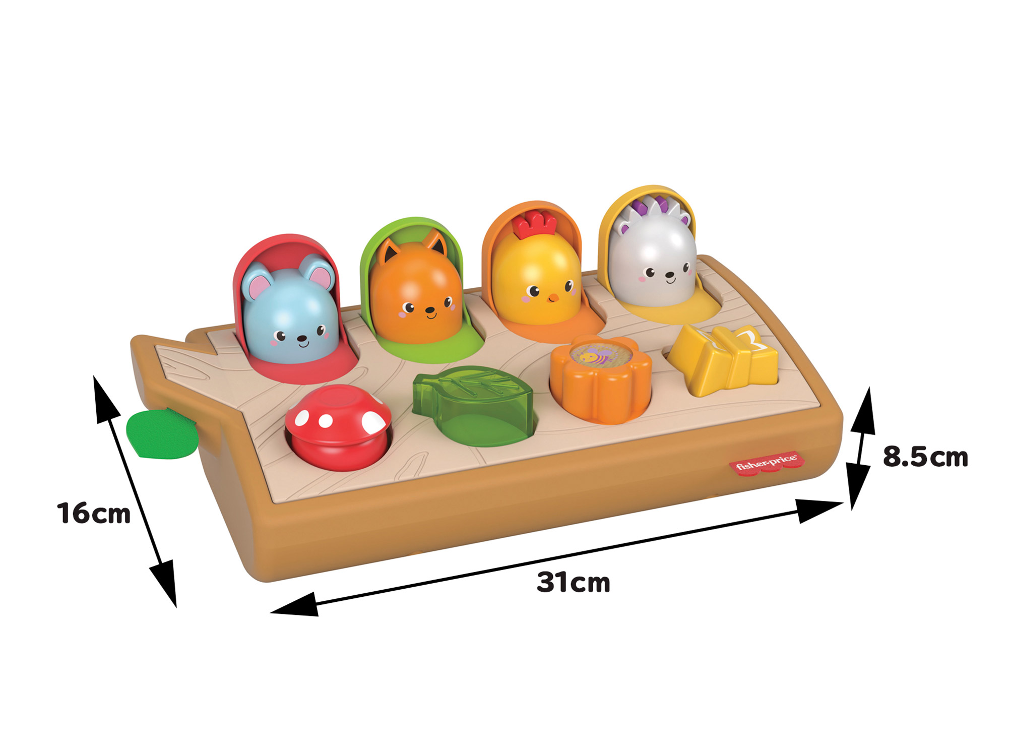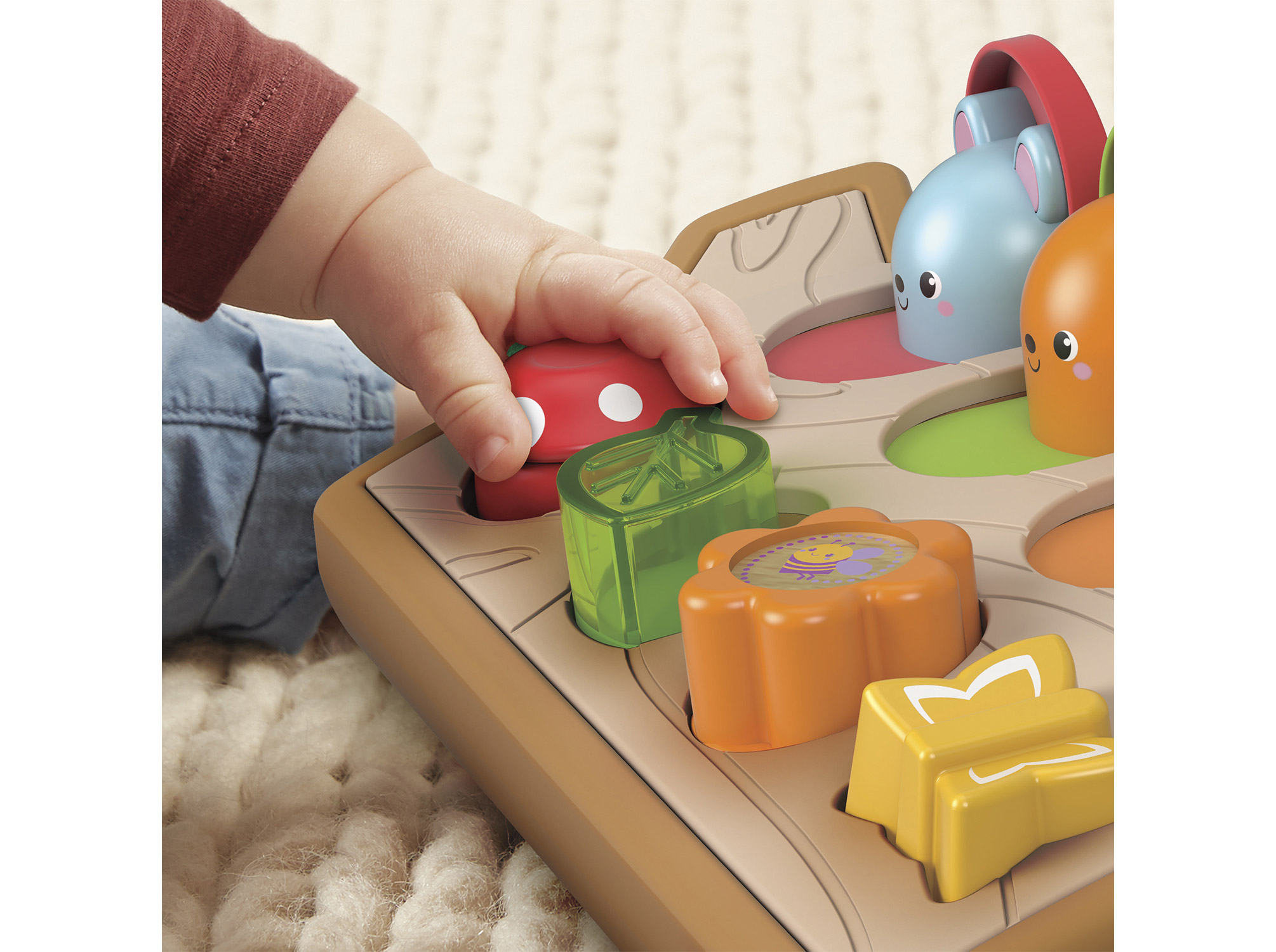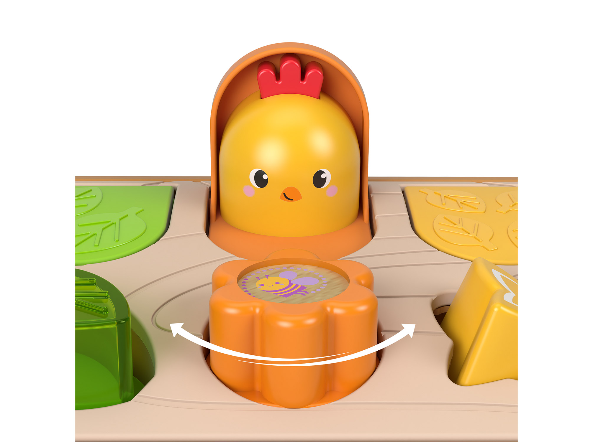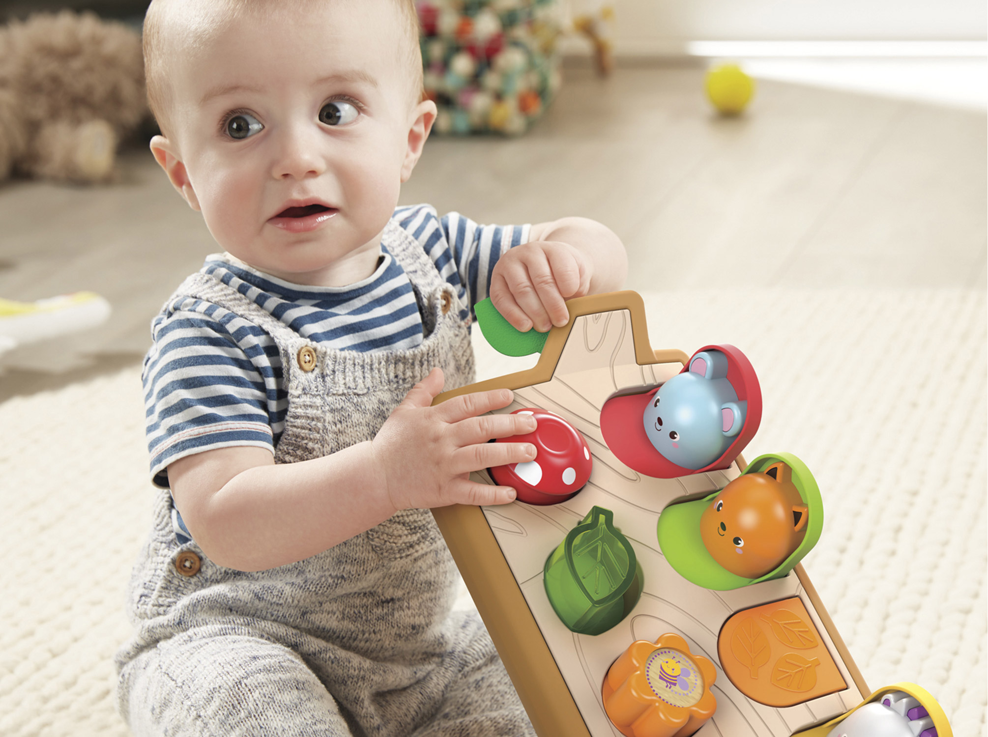 4つのボタンを押したり回したりして遊ぶと、かくれんぼしていたどうぶつたちがぴょっこり!リン!やチュー!などゆかいな音も一緒に鳴ります。手指の発達、手と目の連動、問題解決能力の発達を促します。