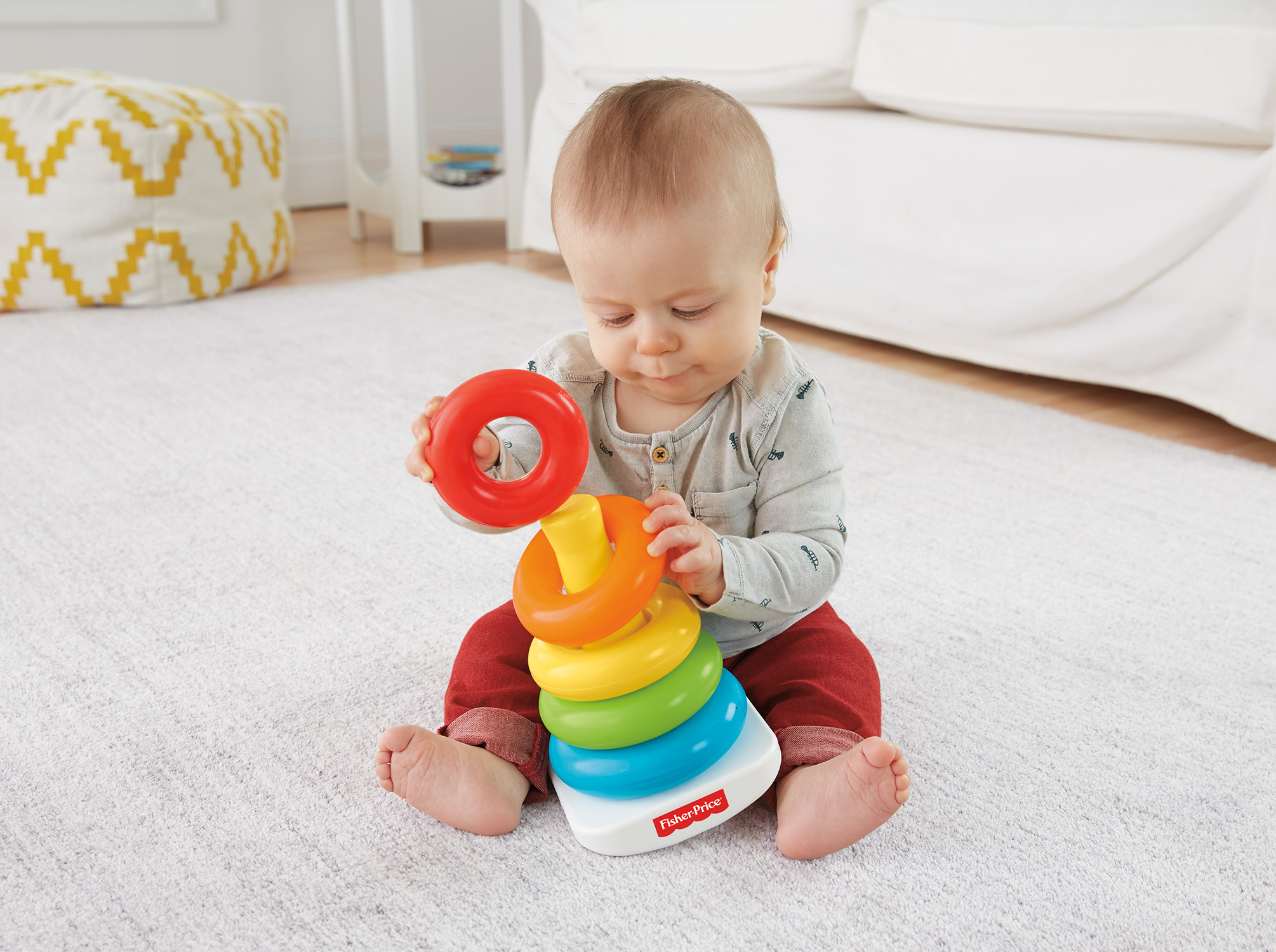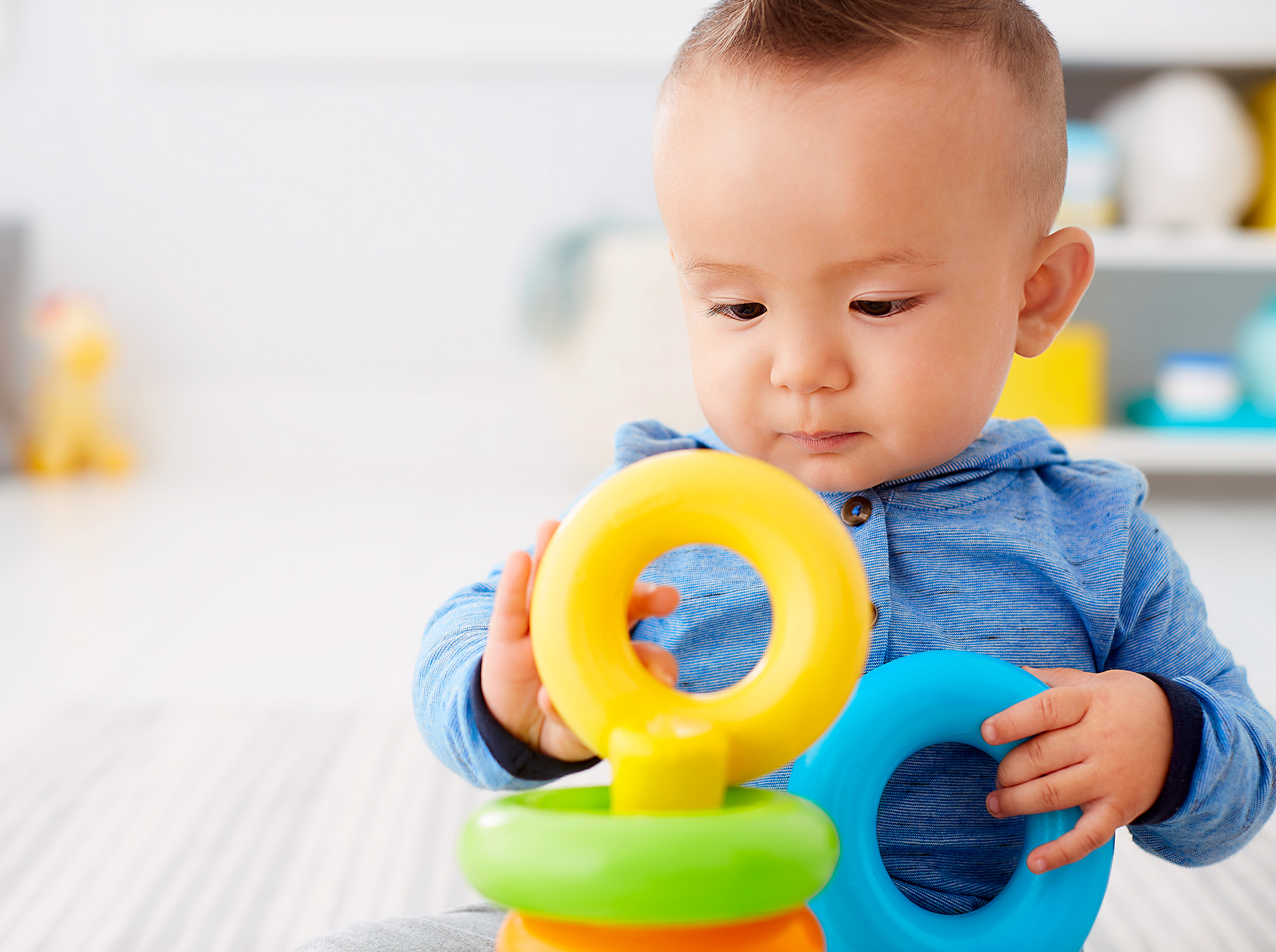 5つのカラフルリングを大きい順にタワーにはめて、ゆらして遊ぼう!