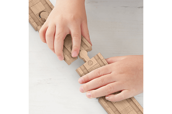 小さなお子さまが簡単かつ安全につなげられるレール。アダプターで旧レールともつなげます。※レールは別売です。