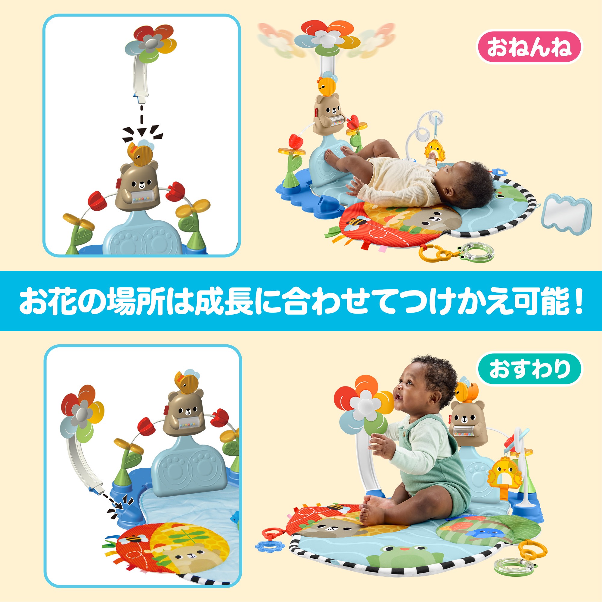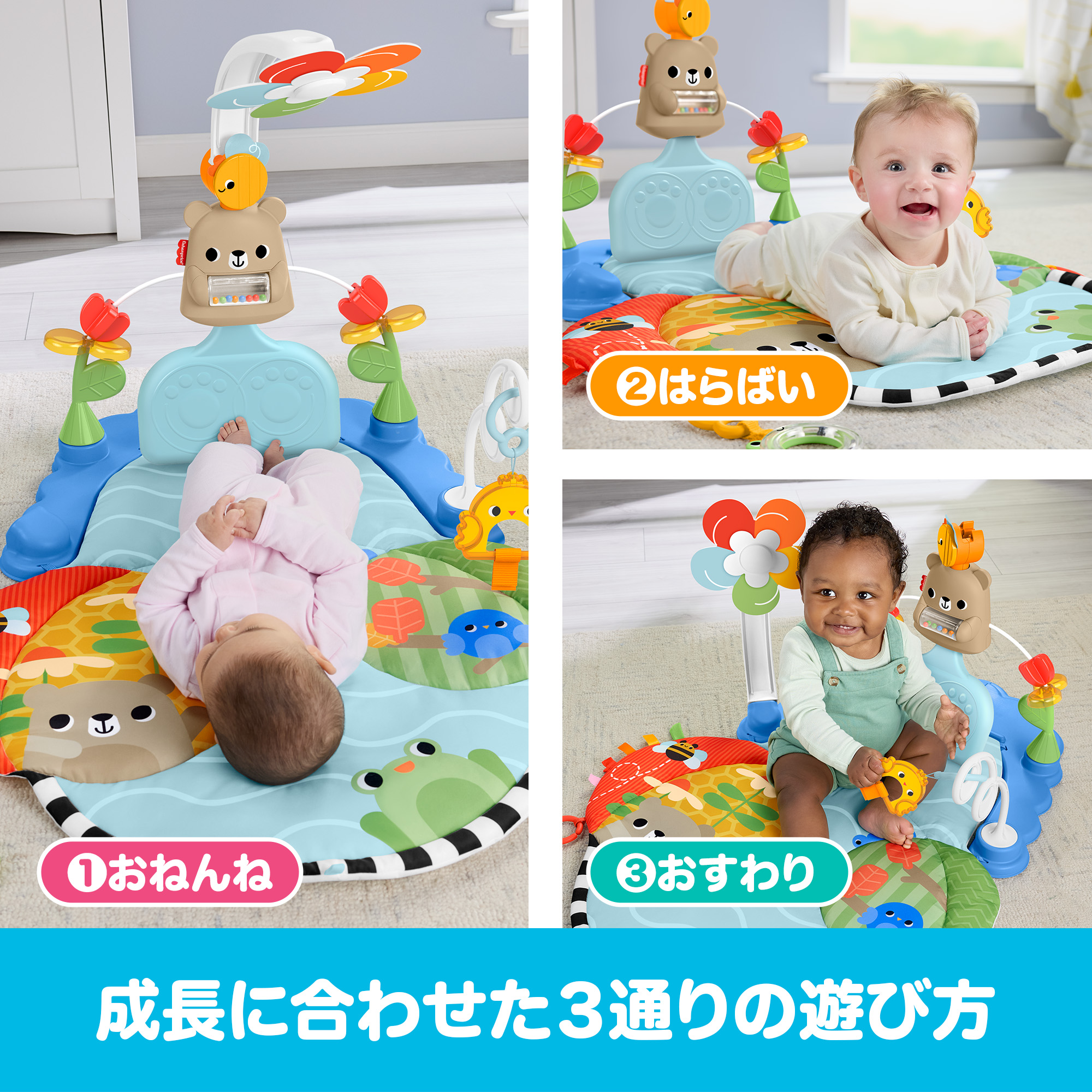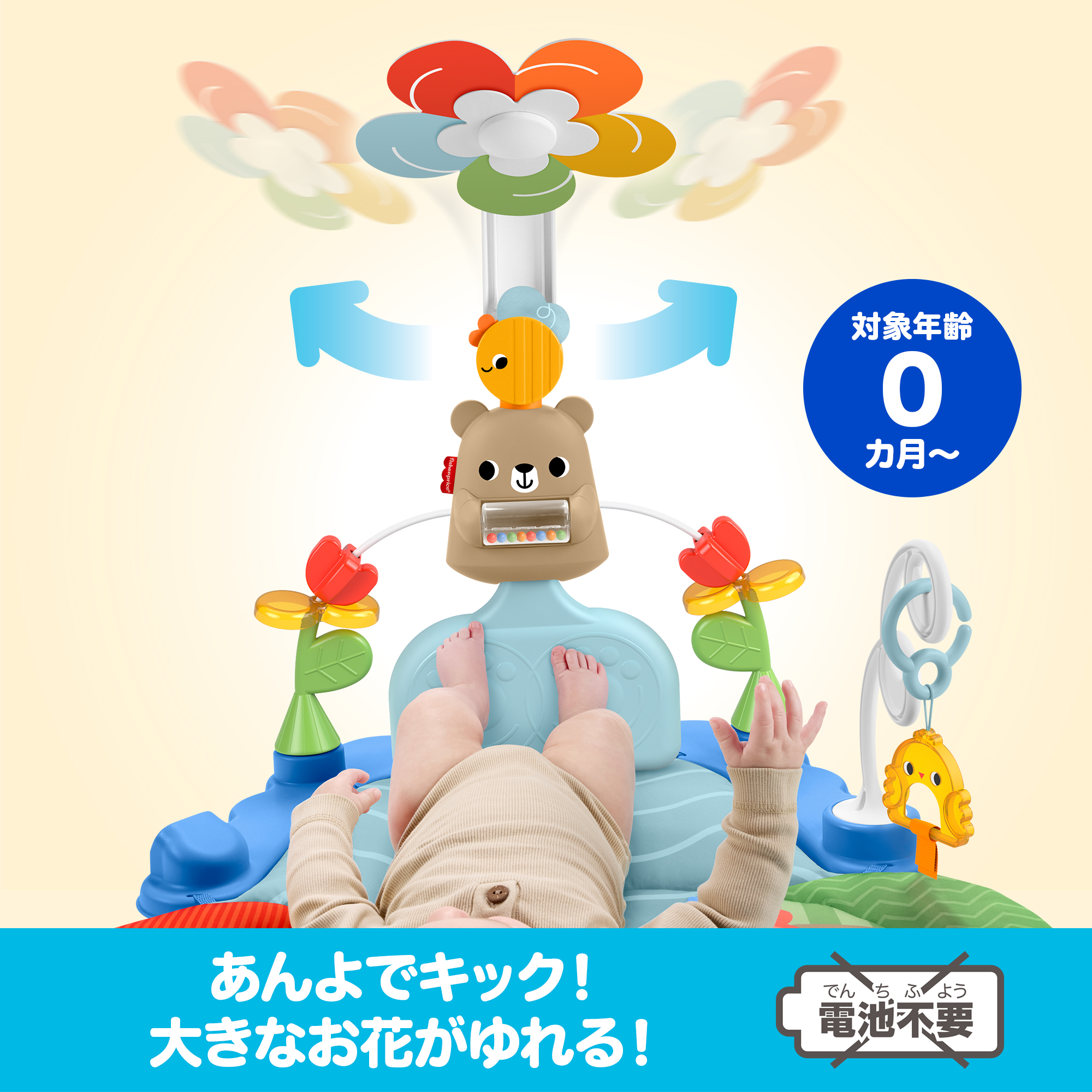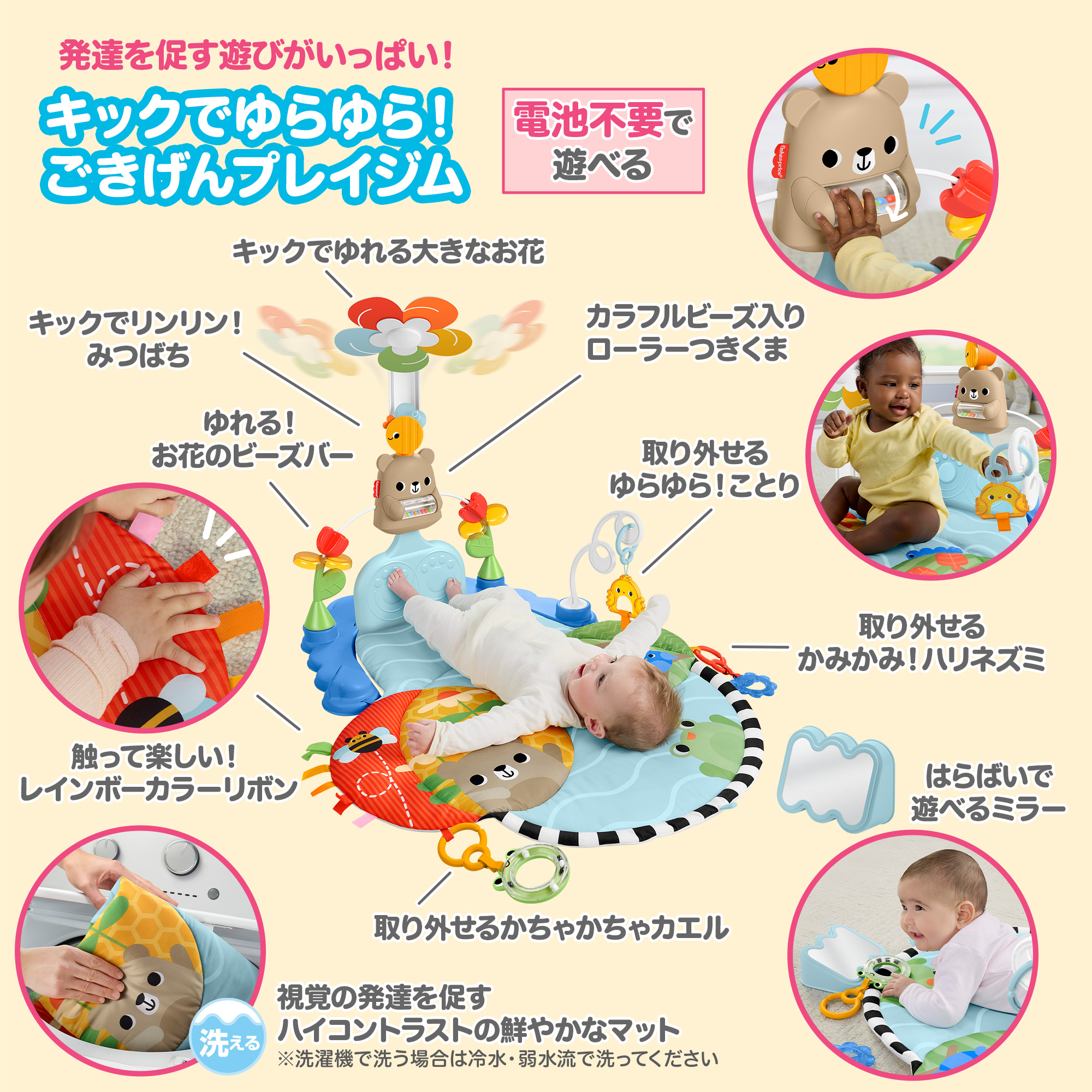 赤ちゃん自らのキックで体を動かして楽しめる、画期的なプレイジム! 電池不要で、ねんね期・うつぶせ期・おすわり&プレイをサポートします。