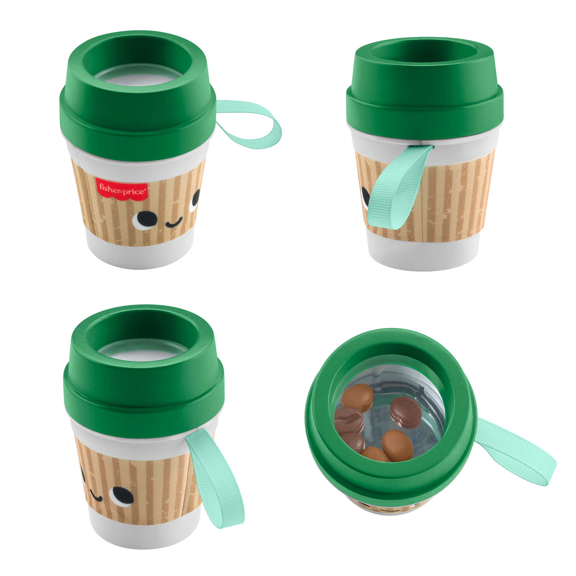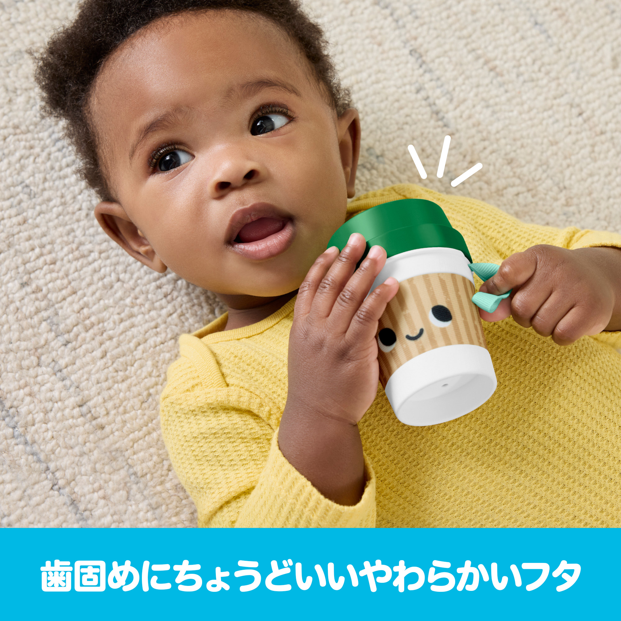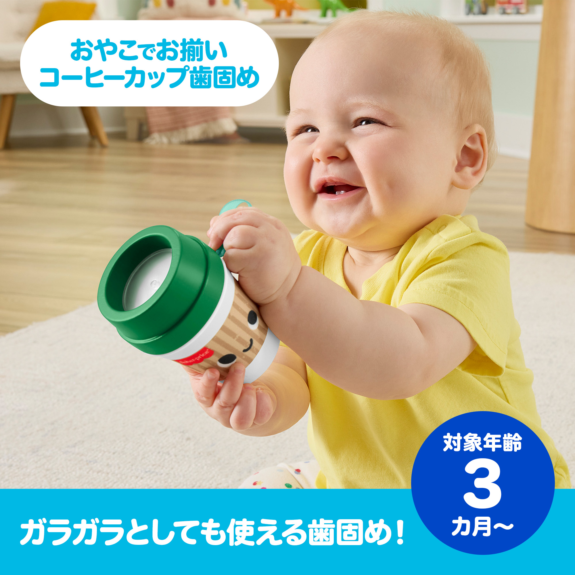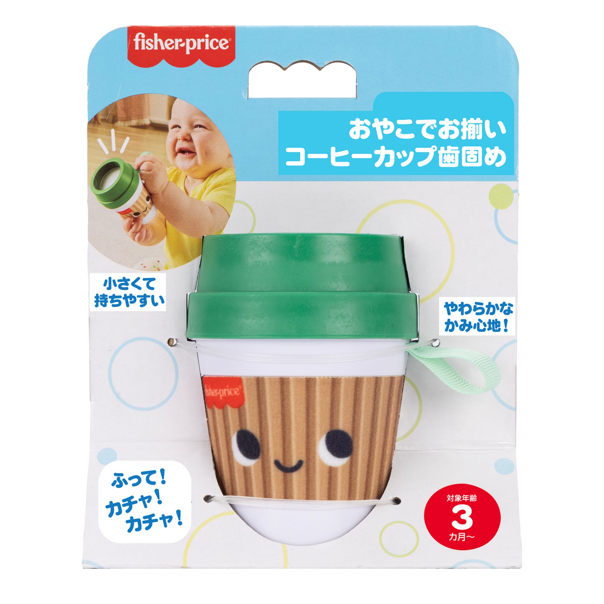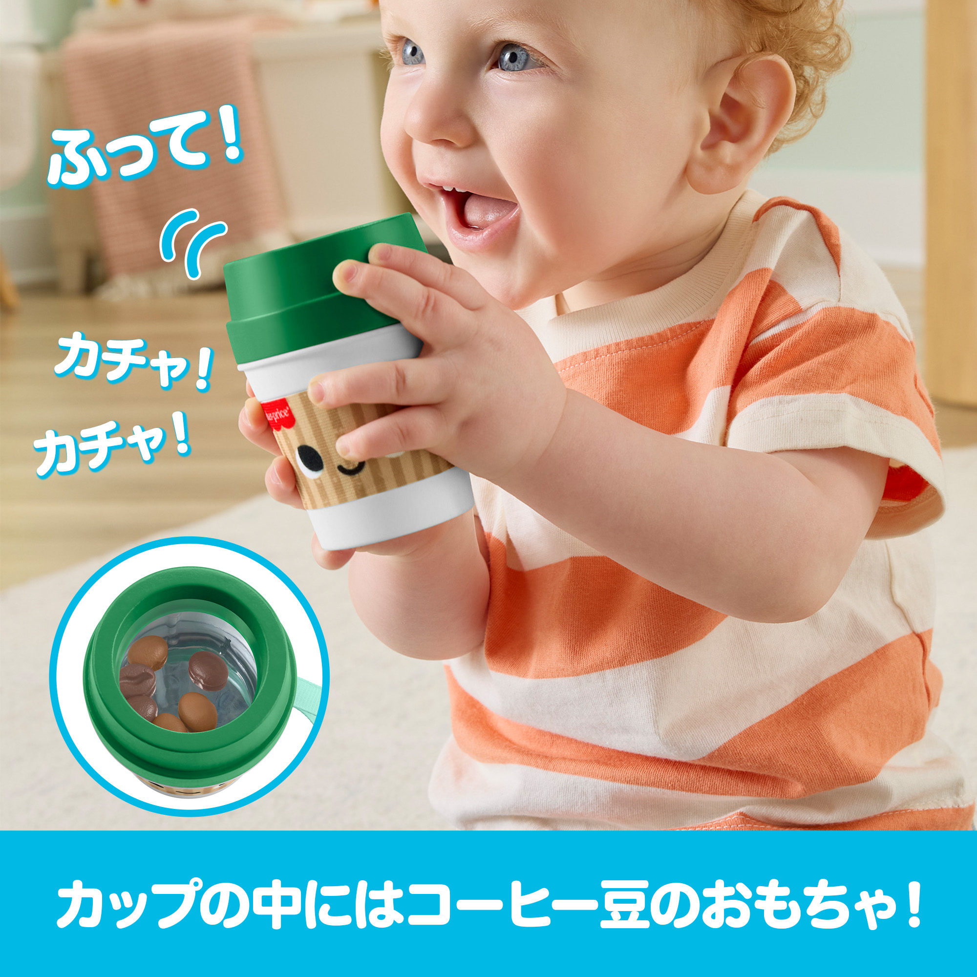 おやこでお揃い コーヒーカップ歯固めで、赤ちゃんも目覚めの一杯。フレッシュな感覚遊びで1日をはじめましょう。テイクアウト用のドリンクカップのような形状で、ガラガラや歯固めとして使えます。カップを振ると中に入ったコーヒー豆のおもちゃがカラカラと音を立て、やわらかいフタは歯固めにちょうどいい噛みごこちです。赤ちゃんサイズのコーヒーカップは、小さな手で握って遊ぶのにぴったり。手指の発達を促し、視覚、聴覚、触覚などの感覚も養います。色やデザインは実物と異なる場合があります。