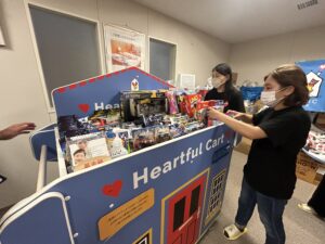 ハートフルカートとは、入院中の子どもたちとそのご家族をサポートするため、2020年より、日用品などの「ちいさなギフト」を病棟にて無償で配布する活動が開始されております。弊社では2023年よりハートフルカートや院内のプレイスペース用の玩具としてご寄付させていただいております。