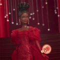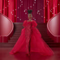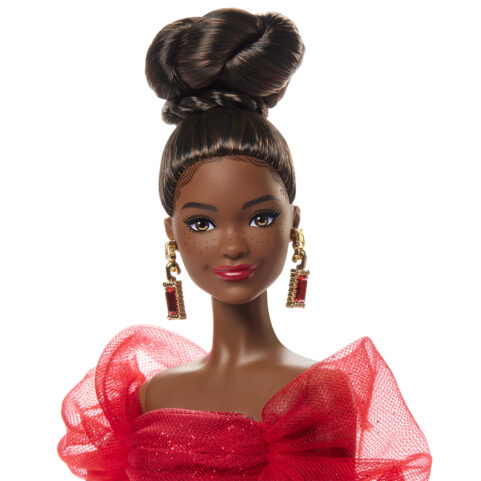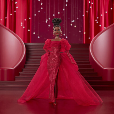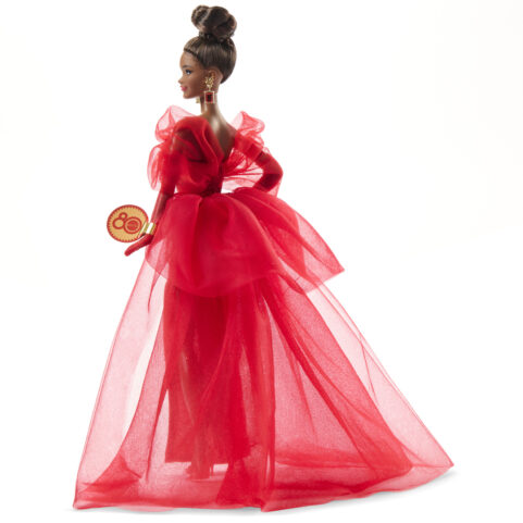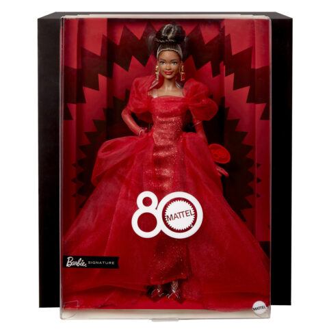 マテル80周年アニバーサリーのバービーシグネチャーが登場!コーポレートカラーであるルビーレッドをモチーフにし、ボリュームのある袖と長いトレーンが特徴のきらびやかなドレスを身に纏っています。イヤリングやグローブ、リップの色もルビーレッドで統一。マテル80周年のリストタグ付き、ドールの他にスタンドが付属します。