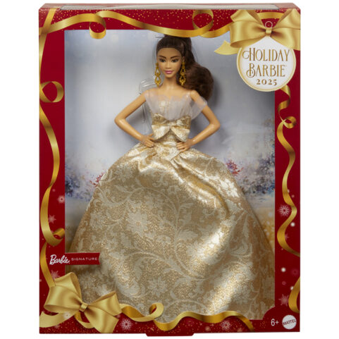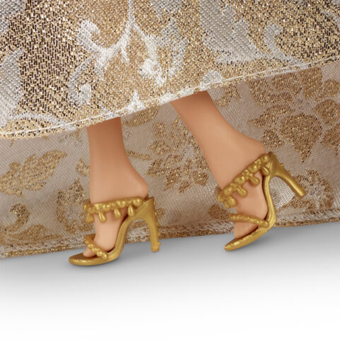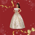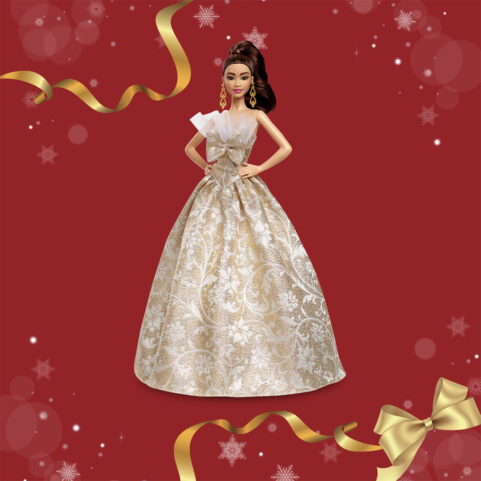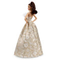 ホリデーバービーが登場!ホリデーシーズンに相応しいゴールド・シルバーの煌びやかなドレスを着用し、ゴールドのドロップイヤリングと飾りのついたゴールドミュールを身に着けています。フルレングスのドレスは、金糸・銀糸を多彩に使った織り模様が特徴です。