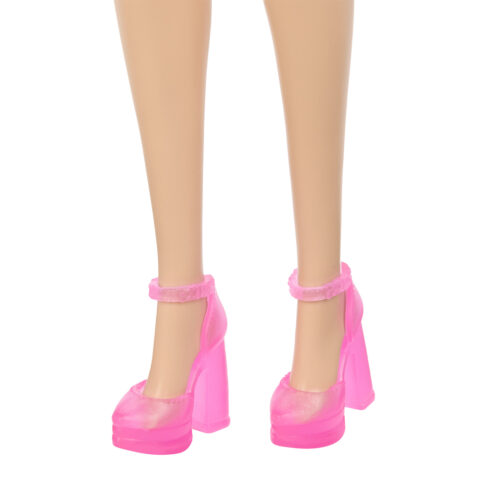 このバービー ドールコレクションは、バービーコア ファッショントレンドにインスパイアされた、かわいいピンクのコーディネートが特徴です。蝶のプリントが施されたピンクのミニドレスを着用。ピンクのヒールがコーディネートを引き立て、スタイリッシュさをプラスします。
