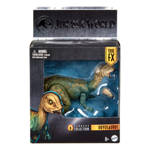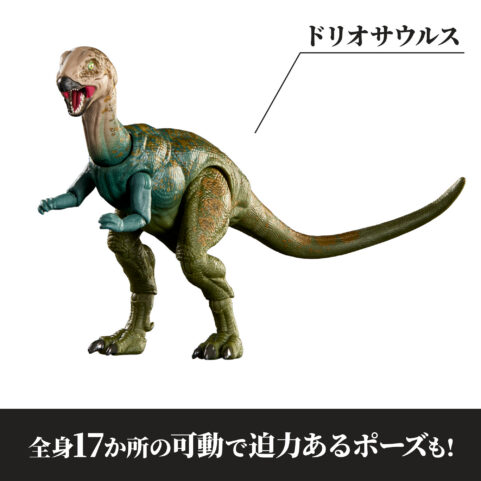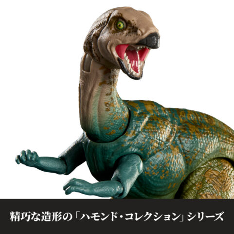 『ジュラシック・ワールド』の興奮と冒険を高品質で表現した「ハモンド・コレクション」シリーズに、ドリオサウルスが登場。写真のようにリアルな目や、細部までこだわった造形で、コレクターも満足の仕上がりです。全身17か所が可動し、口を開いた表情をよりリアルに再現できる付け替え用あごパーツが付属。迫力あるグラフィックと大きなウィンドウが特徴のデラックスパッケージは、箱のままでも美しく飾れます。