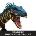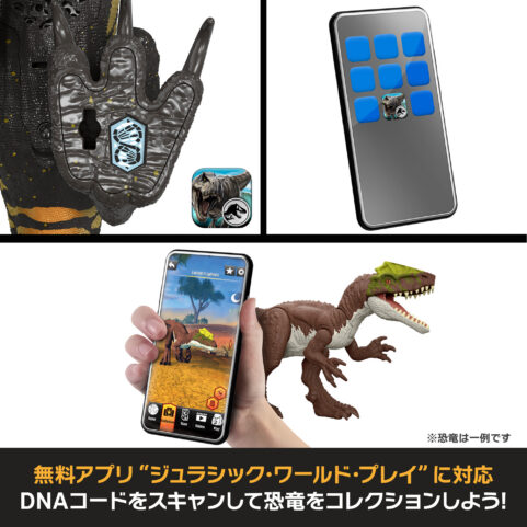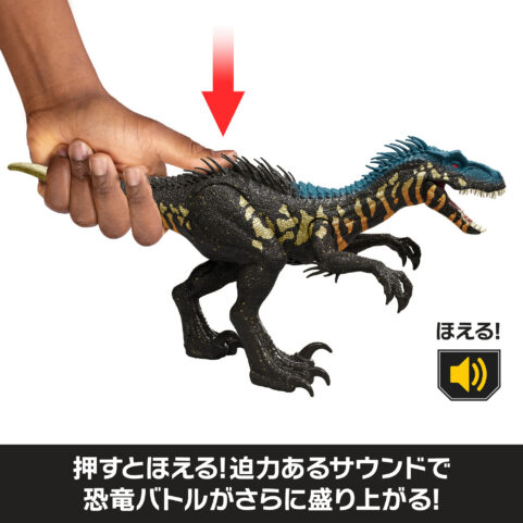 映画『ジュラシック・ワールド/炎の王国』に登場するインドラプトルが、迫力のフィギュアになって登場。胴体全体にリアルな触り心地の「リアルフィール」加工を施し、独特な姿とリイマジンドされたカラーリングを細部まで表現しています。本体を押すと、荒々しいほえ声が鳴り、バトル遊びがさらに白熱。全長約36cmのサイズで関節も動き、さまざまなポーズが楽しめます。足のコードを専用アプリで読み取れば、AR遊びやデジタルコレクションも可能。