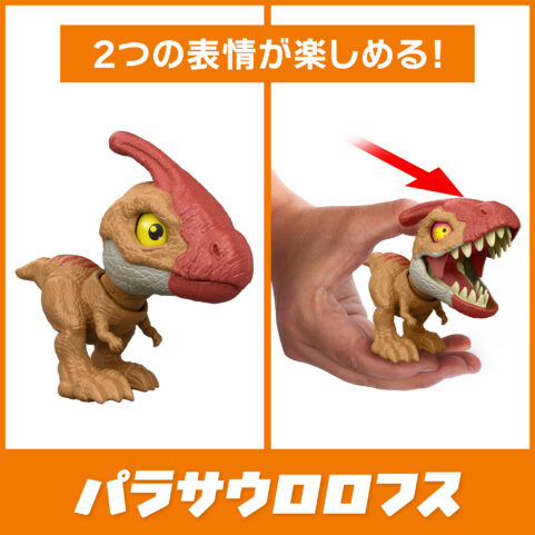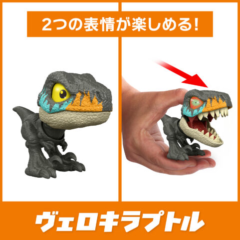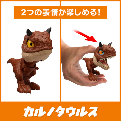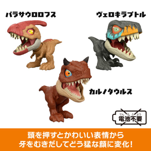ジュラシック・ワールド かみかみ恐竜コレクションの恐竜フィギュアは、簡単な操作で表情がガラッと変わります。頭を押し下げて口を開くと、かわいい顔が一瞬で怒った顔に変身!大きな上の歯が現れ、目つきもやさしい表情から凶暴な表情へと変わります。何度でも表情チェンジができるので、楽しく繰り返し遊べます。人気の恐竜カルノタウルス、ヴェロキラプトル、パラサウロロフスが含まれたアソート。パッケージにもかみついた跡があります。