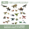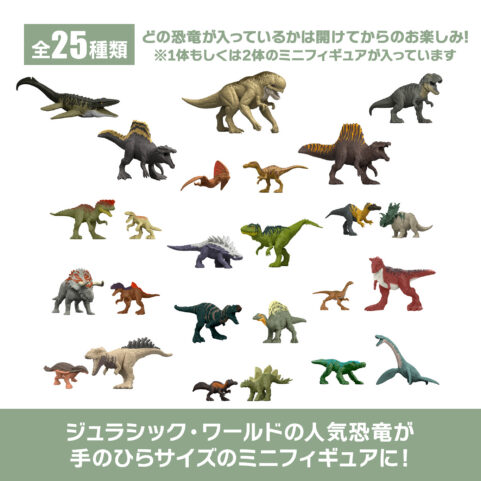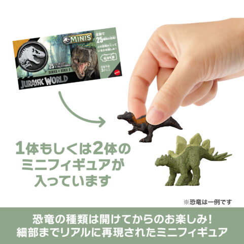 コンパクトなサイズでありながら、細部までリアルに再現された恐竜のミニフィギュアです。肉食・草食恐竜をはじめ、翼竜や水生種、陸上種など多彩なラインアップ。集めて迫力あるバトル遊びやディスプレイが楽しめます。各ボックスには「超大型1体」「大型1体+小型1体」「中型2体」のいずれかが入ったブラインドパック仕様。全部で25種類、どの恐竜が出るかは開けてからのお楽しみです。