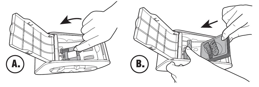 B.カードを伏せてカードランチャーの中のレバーの下に入れます。