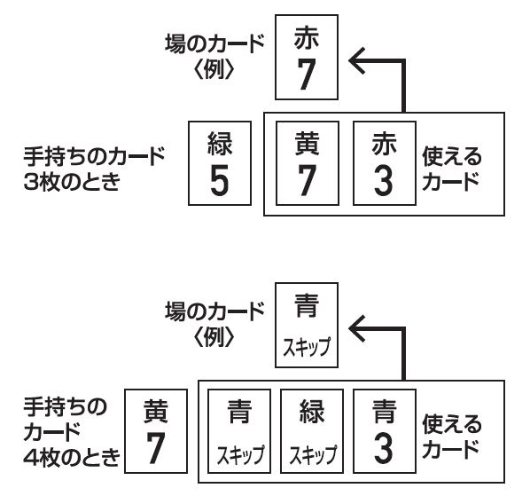 たとえば、場のカードが黄色の7のときは、黄色のディスカードオールを一番上にして黄色のカードを全て捨てられます。(また、場のカードがディスカードオールのときは、他の色のディスカードオールといっしょに同じ色のカードを全て捨てられます。)